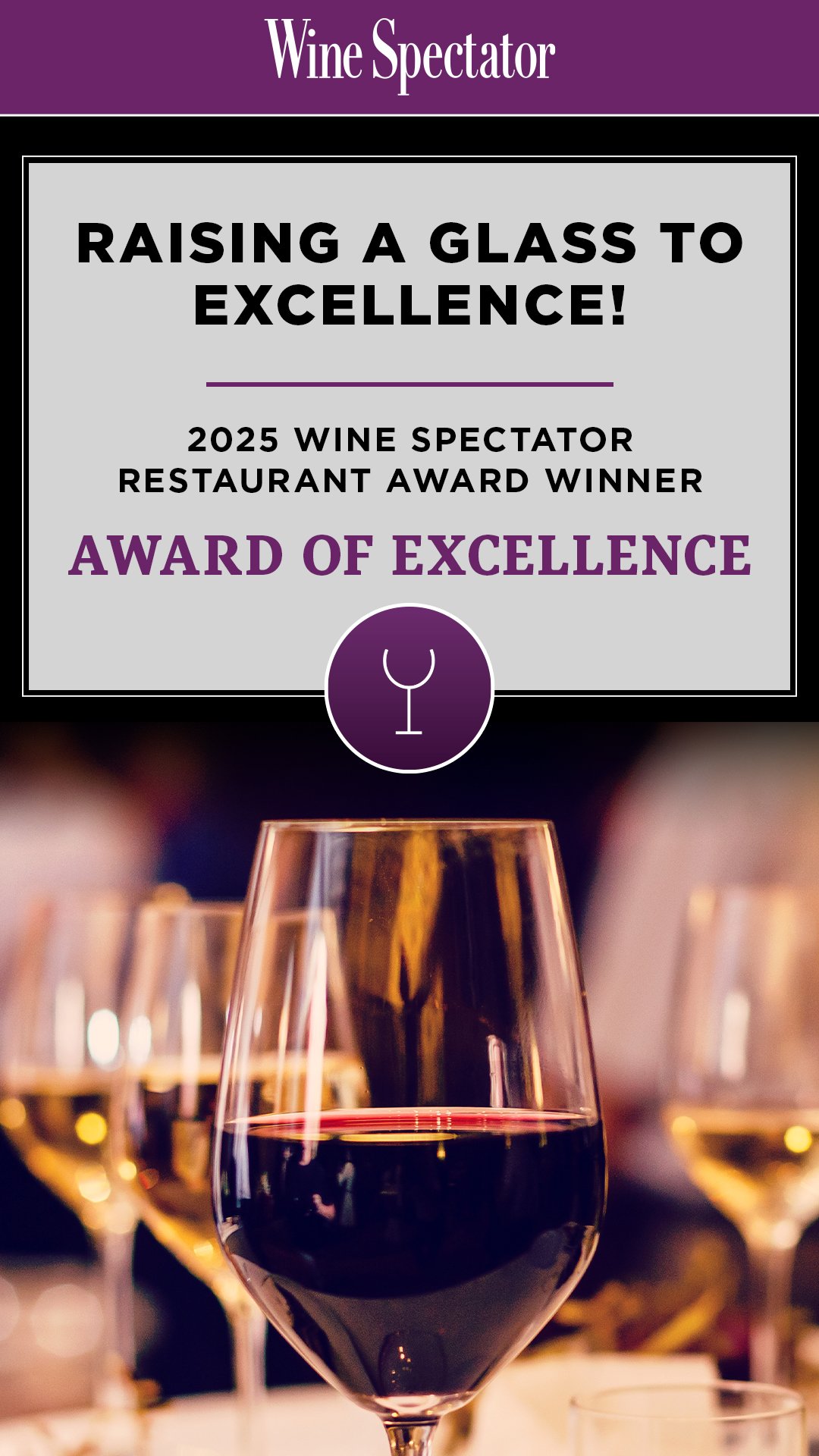 Antonio's is extremely proud to announce we are again a winner of the Wine Spectator Award of Excellence in 2024 for our extensive wine selection — every year since 2018!